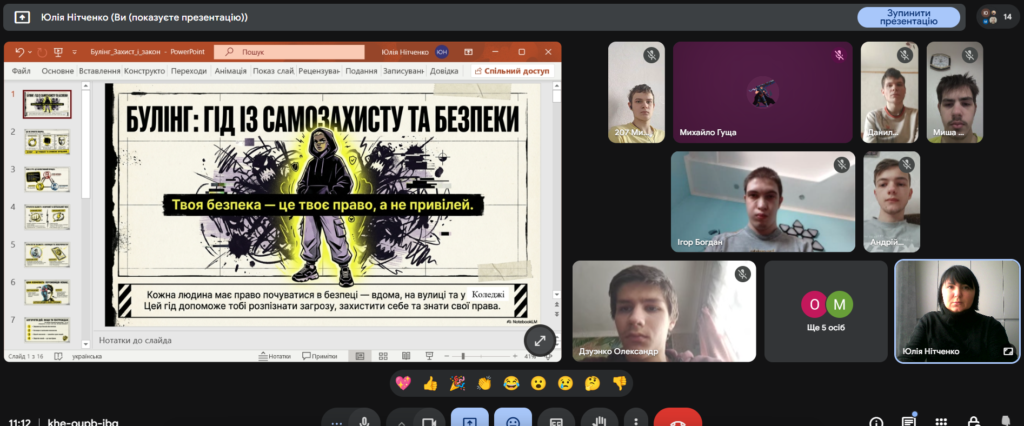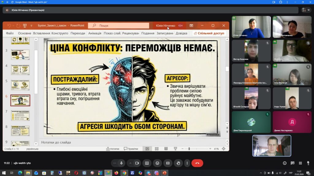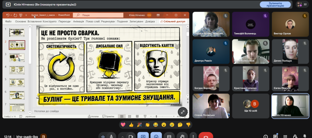 З нагоди Міжнародного дня протидії булінгу 27 лютого 2026 року в Комунальному закладі професійної (професійно-технічної) освіти “Київський професійний коледж будівництва і комунального господарства” відбулась бесіда “Булінг: гід із самозахисту та безпеки”, яку провела практичний психолог Юлія Нітченко.