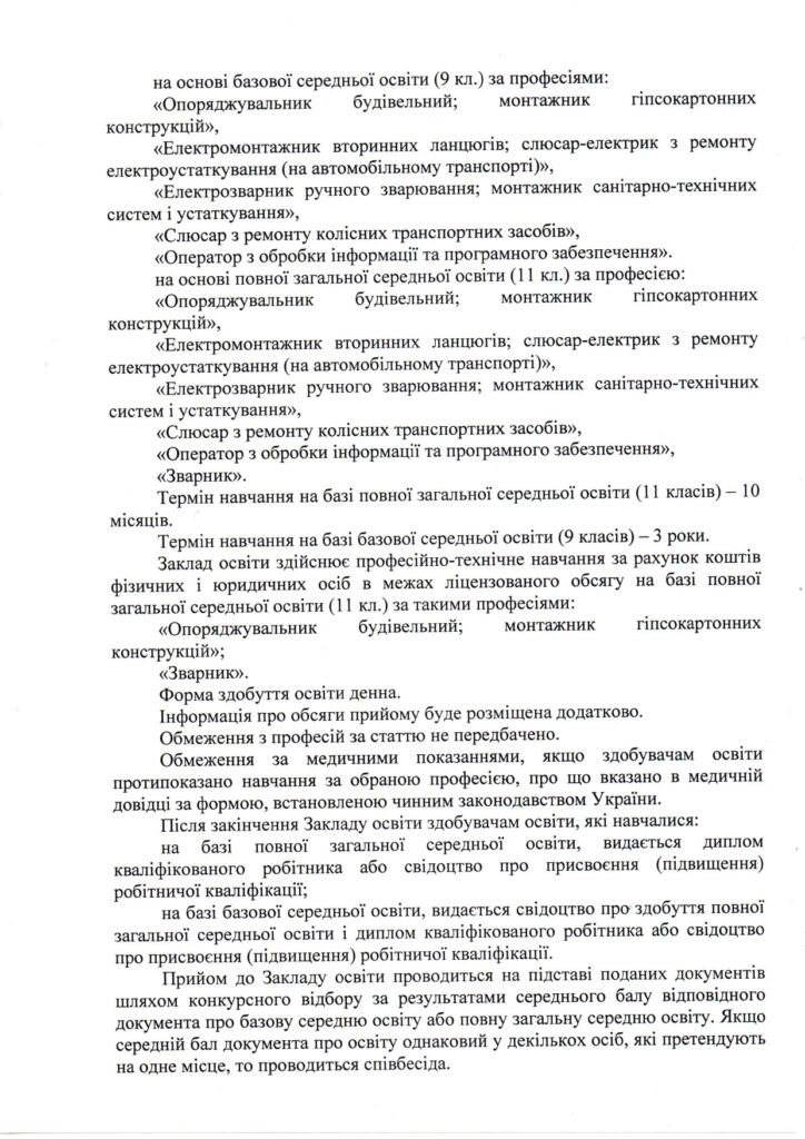 Інформація щодо набору